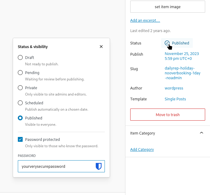 It is possible to protect an item with a password. To do this, click next to "Status" on the right side of the item and add a password. Now, users can only book this item if the correct password was entered.